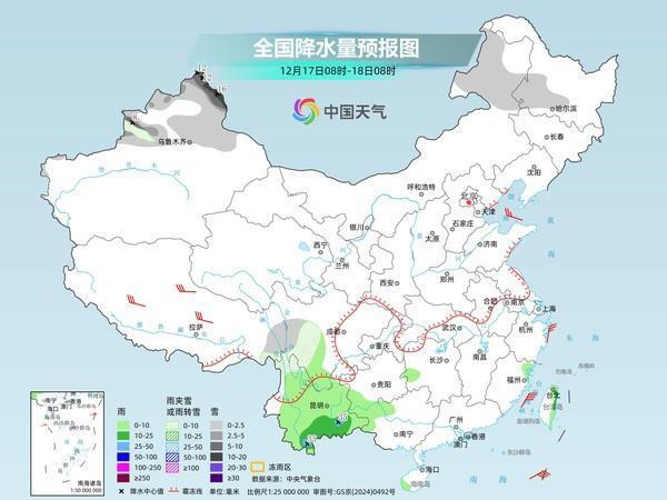 后天,内蒙古东北部、黑龙江中北部、新疆北部和南疆西部山区、甘肃河西等地部分地区有小到中雪或雨夹雪,其中,新疆沿天山地区和伊犁河谷局地有大到暴雪。湖南南部、福建东部和南部、西南地区南部、广西西南部、广东东部和南部、海南岛东部、台湾岛东部等地部分地区有小到中雨,其中,广东东部局地有大雨。